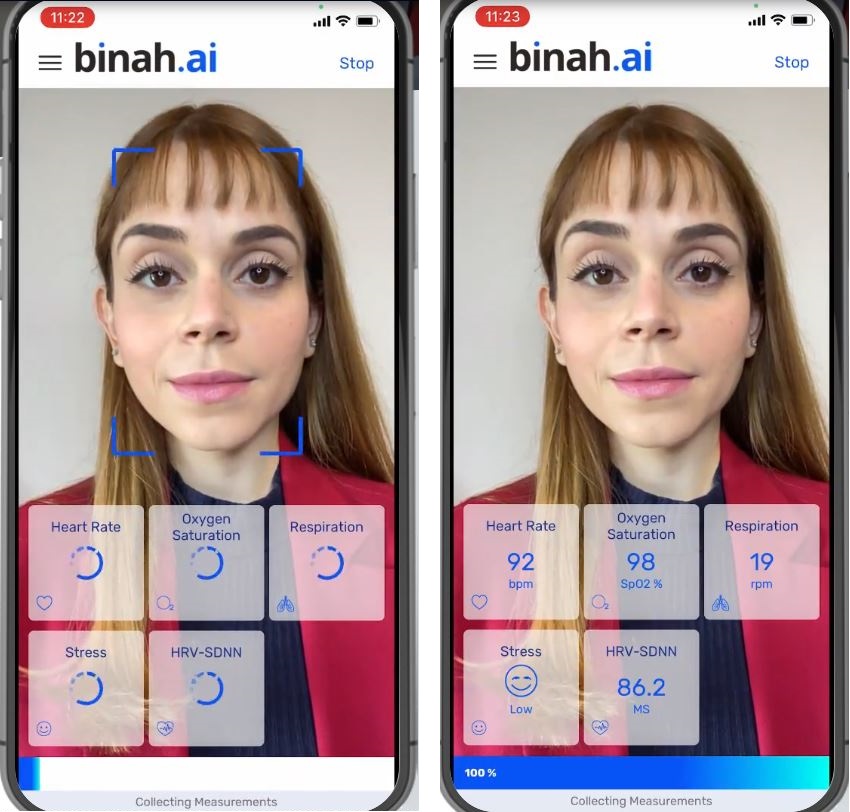 Компания Binah.ai разработала приложение, которое анализирует лицо человека, чтобы зарегистрировать показатели его здоровья, такое как частота дыхания и вариабельность сердечного ритма. Компания использует искусственный интеллект и маломощные камеры, встроенные в телефоны и ноутбуки для удаленного мониторинга жизненно важных признаков.