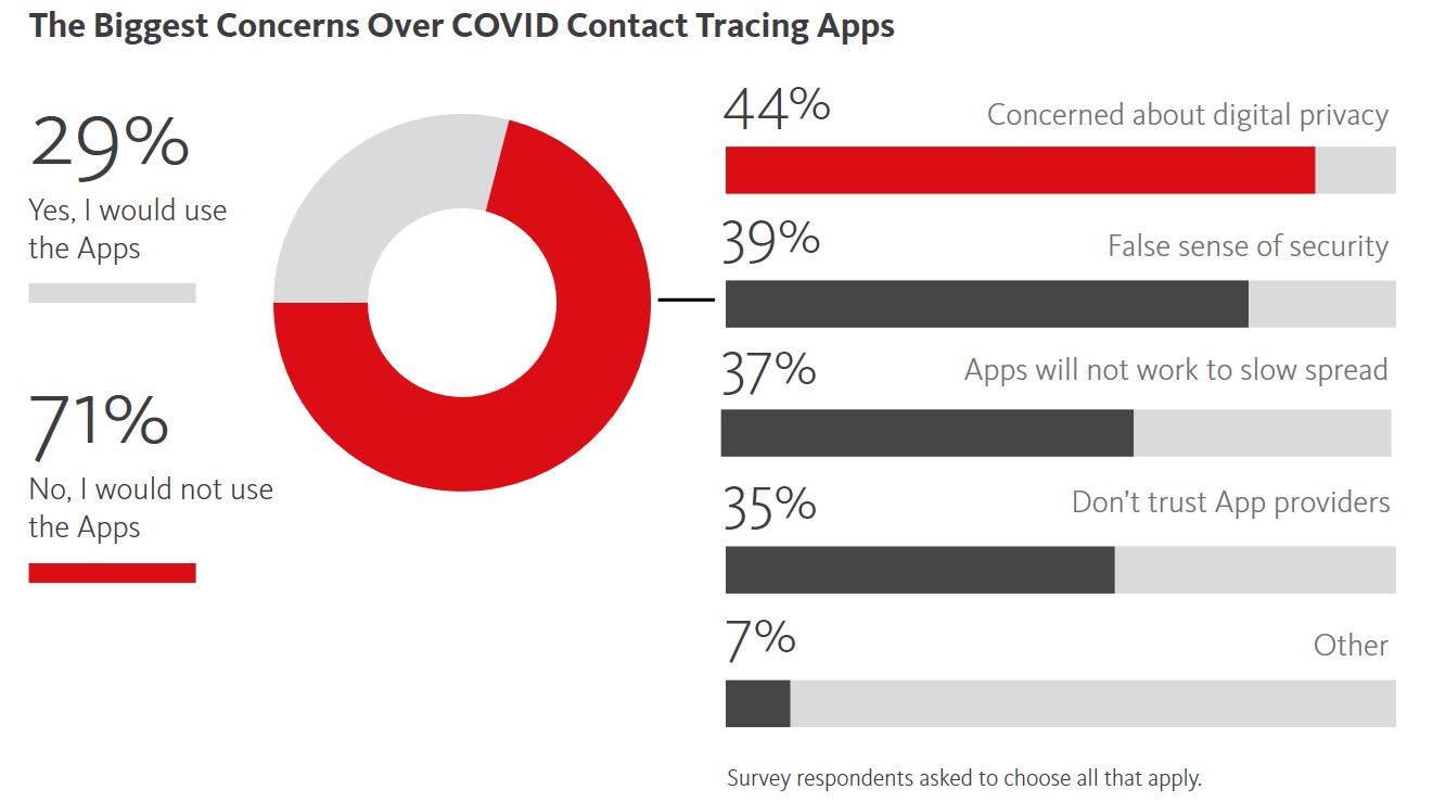 Согласно недавнему исследованию, проведенному по заказу производителя систем информационной безопасности компании Avira, 71% американцев говорят, что не будут использовать приложения для отслеживания контактов с людьми, зараженными COVID-19. При этом многие из них ссылаются на потенциальные проблемы с сохранностью личных данных и безопасностью.