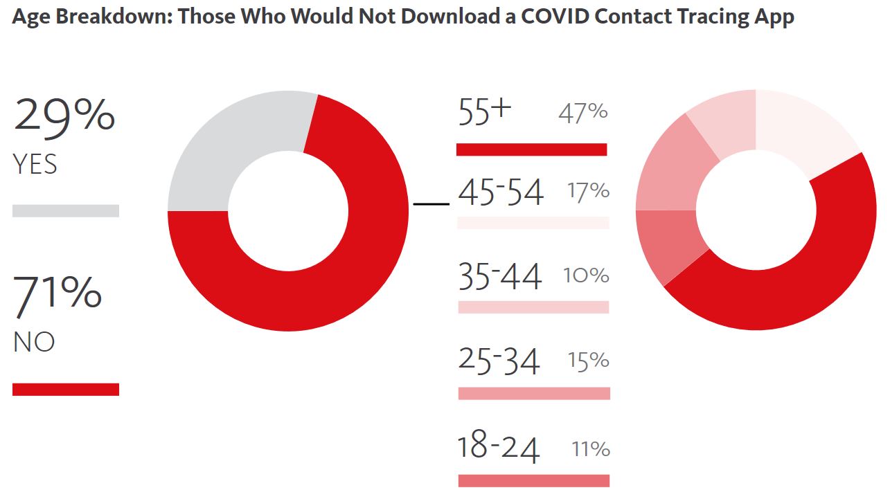Люди в возрасте от 25 до 44 лет рассматривают приложения для отслеживания контактов COVID как самую большую на сегодняшний день угрозу для своей цифровой конфиденциальности - большую, чем кража личных данных или киберпреступность. Те, кому за 55, в наименьшей степени используют эти приложения, говоря, что они также не доверяют технологиям обеспечения безопасности своих данных. Они также выразили обеспокоенность по поводу того, что приложения дают ложное ощущение безопасности.