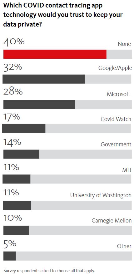Более 40% опрошенных сказали, что не доверяют ни одной организации хранение своей информации. Примерно треть опрошенных доверяют Google или Apple, 28% сказали, что доверяют Microsoft, и только 14% сказали, что доверят свои данные правительству. Люди говорили, что в случае необходимости обмена данными им будет удобнее всего отправлять их непосредственно в больницы.