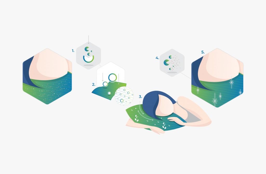 Неактивные пробиотики в виде спор инкапсулируются и интегрируются в текстиль. Трение открывает микрокапсулы и высвобождает споры, которые поглощают влагу и самоактивируются, а затем превращаются в пробиотические бактерии, которые начинают потреблять аллергены.