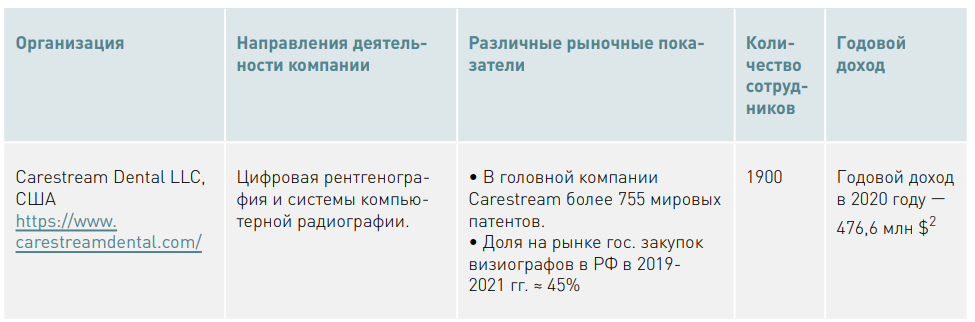 - На рынке КЛКТ в России представлены продукты как крупных компаний (Carestream Dental LLC, CEFLA S.C., KaVo Kerr Group), так и небольших — с численностью сотрудников до 20 человек (FONA SRL).