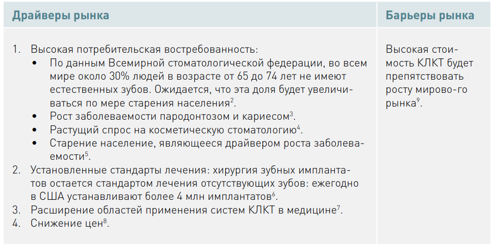 - Основные драйверы роста рынка — высокая потребительская востребованность, а также установленные стандарты имплантации зубов. Основное ограничение — высокая стоимость оборудования.
