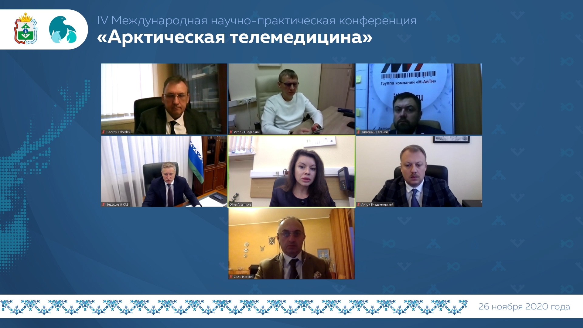 26 ноября 2020 года в онлайн формате состоялась IV Международная научно-практическая конференция «Арктическая телемедицина». Целью конференции было обсуждение вопросов использования информационных технологий для обеспечения доступности и качества медицинской помощи в условиях Крайнего Севера (Арктической зоны).