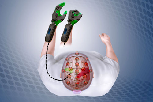 Новое устройство компании Neurolutions IpsiHand предназначено для использования в постинсультной терапии для пациентов в возрасте 18 лет и старше, что делает его первым неинвазивным устройством типа "мозг-компьютерный интерфейс", получившим официальное разрешение на использование. Система включает в себя головное устройство с электродами ЭЭГ для регистрации активности мозга на стороне, не затронутой инсультом. Эти данные автоматически посылаются на планшет для определения предполагаемого движения мышц, после чего планшет передает сигнал для перемещения элементов накладки на руке.