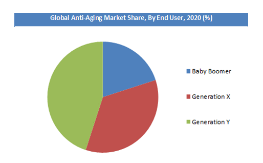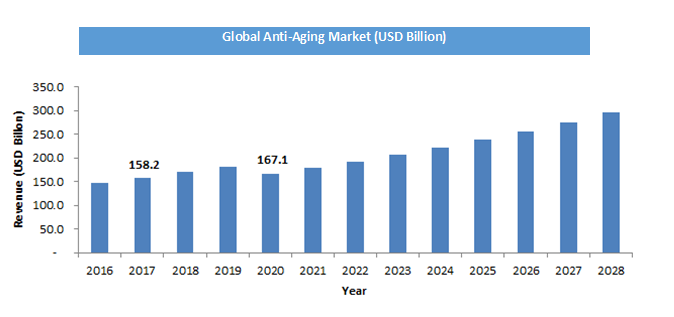 Согласно отчету Zion Market Research, глобальный рынок anti-aging составил 111,6 млрд долларов в 2020 году и, как ожидается, достигнет 162,9 млрд долларов к 2028 году. Среднегодовой темп роста с 2021 по 2028 годы составит 4,3%. В зависимости от возраста конечных потребителей рынок был разделен на бэби-бумеров, поколение X и поколение Y. В настоящее время на поколение X приходится более половины этого рынка.