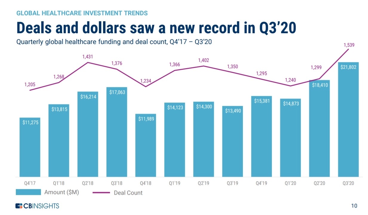 Согласно новым данным исследовательской компании CBInsights, в третьем квартале 2020 года финансирование здравоохранения достигло нового рекорда. Компании здравоохранения по всему миру привлекли в общей сложности $21,8 млрд, что даже превысило рекордный показатель прошлого квартала в $18,4 млрд. Общее количество сделок также увеличилось на 18% по сравнению с предыдущим кварталом, с 1299 сделок до 1539.