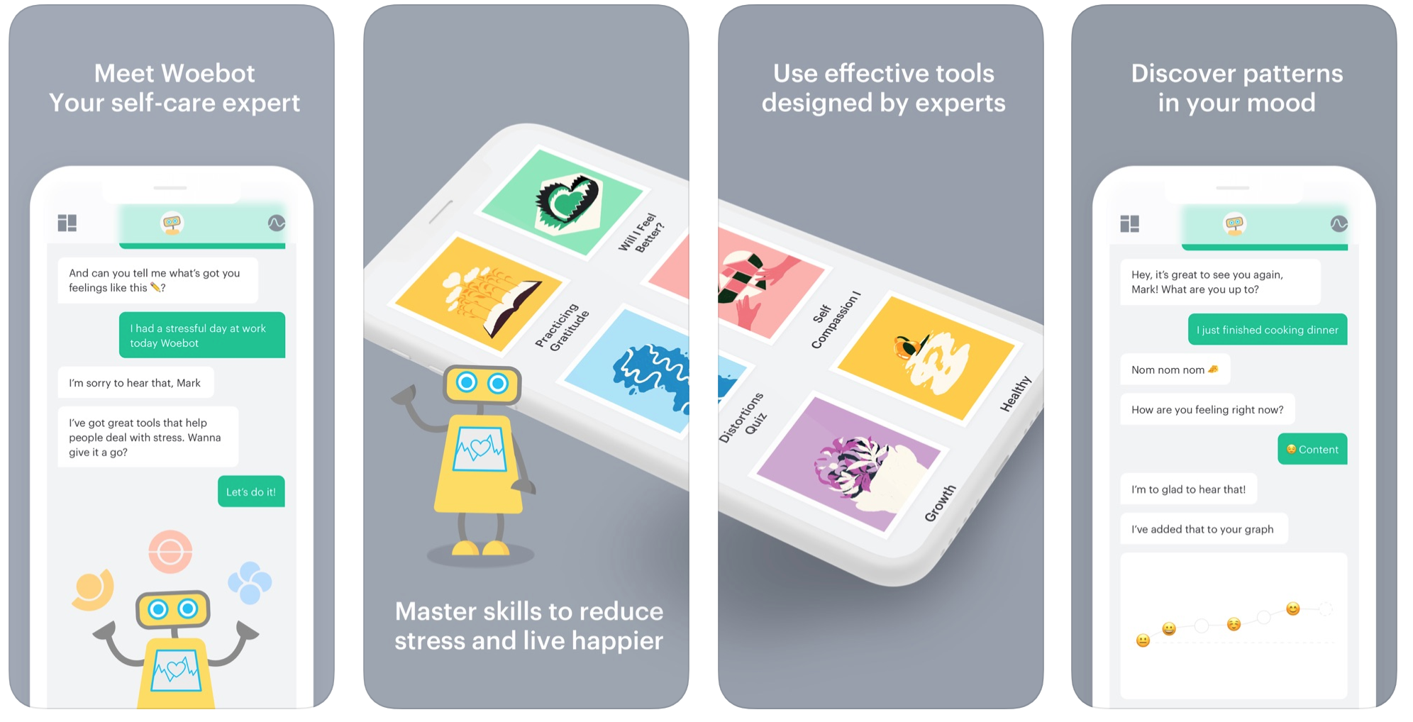 Woebot работает через Facebook Messenger, действуя как персональный психотерапевт и помогая пользователю справиться со своими проблемами. С помощью разговора на обычном "человеческом" языке приложение позволяет пользователю получить эмоциональную поддержку, которая ему нужна, и научиться практическим методам, позволяющим изменить ход мыслей о происходящих в его жизни явлениях. Этот "умный" робот-психотерапевт доступен пациенту в любое время и из любого места, и позволяет получить доступную психологическую помощь людям, которые в этом нуждаются, причем за очень небольшую плату