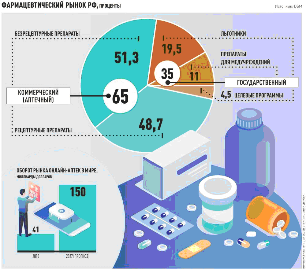 Рецептурные препараты составляют почти половину товарного ассортимента на фармрынке – 48,7%. И пока не доступны для приобретения в оналйн-режиме, хотя именно это направление развивается в России и во всем мире очень активно. Так, оборот рынка онлайн-аптек в мире в 2018 году составлял 41 млрд. долларов. А к 2027 году эксперты прогнозируют рост его объемов до 150 млрд. долларов.