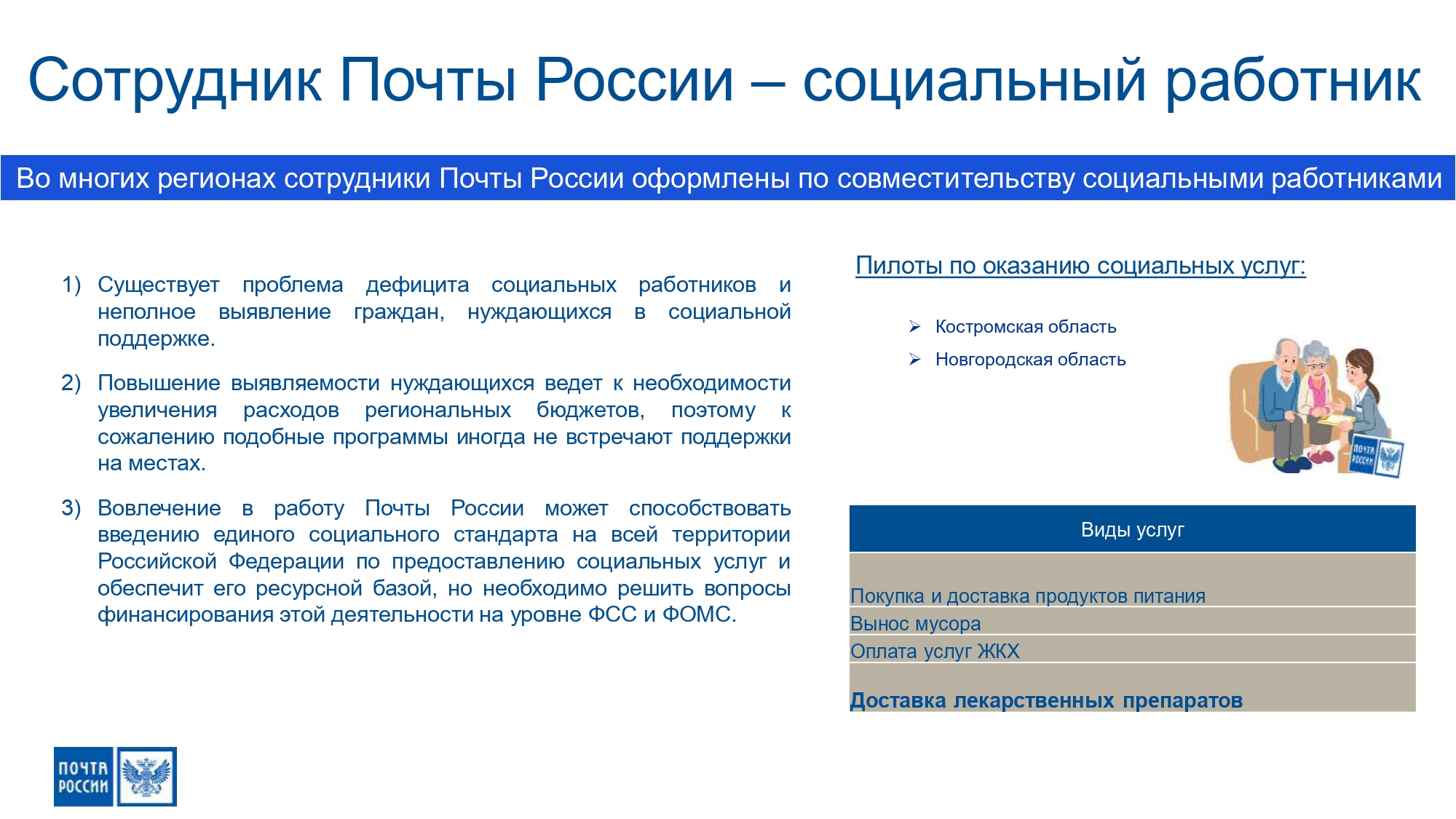 Не так давно президент страны Владимир Путин дан ряд поручений, которые касаются привлечения "Почты России" к оказанию социальных и отчасти медицинских услуг. Сейчас пилотный проект реализуется в Калужской области.