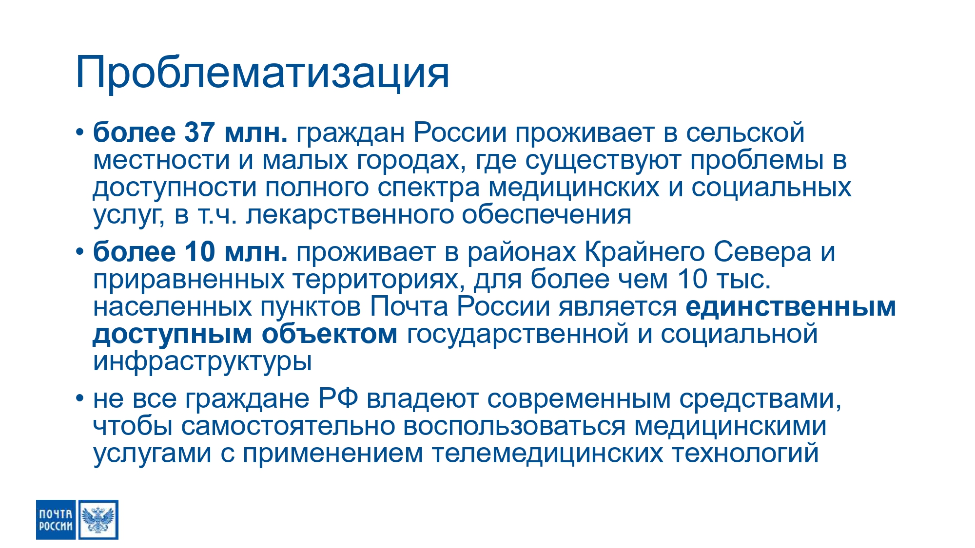 Советник по приоритетным проектам дирекции госпрограмм и международной деятельности АО "Почта России" Андрей Алмазов коснулся темы инфраструктурных ограничений. 37 млн россиян проживает в сельской местности, где не всегда устойчивая связь и средства подключения, чтобы самостоятельно воспользоваться услугами телемедицины. Помочь таким людям могла бы "Почта России" и ее сотрудники.