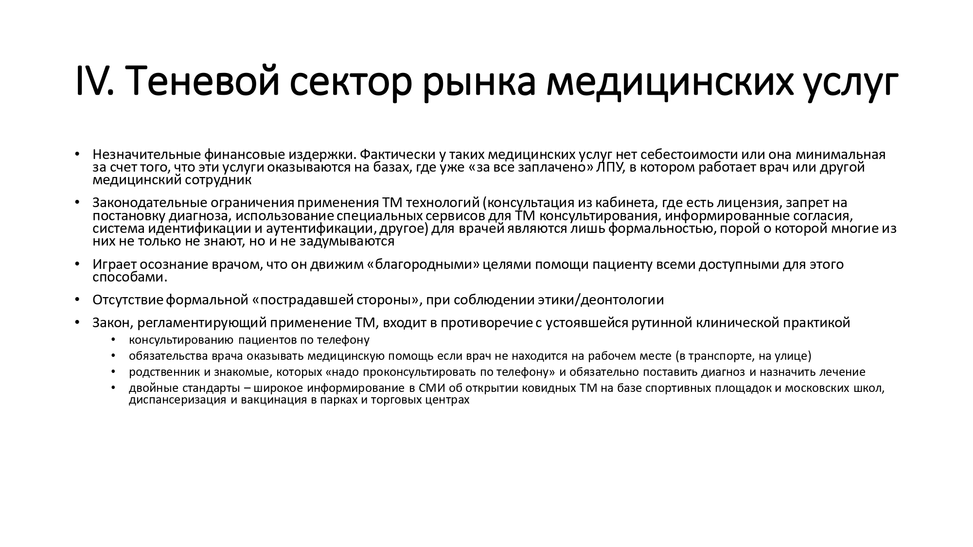 Выступающий коснулся темы теневого сектора рынка медицинских услуг. После первичного приема пациенты часто получают номер телефона лечащего врача и затем напрямую обращаются к нему за консультациями и напрямую платят ему за работу. Пока ТМ не станет доступнее в государственных ЛПУ, то, вероятно, это явление будет процветать.