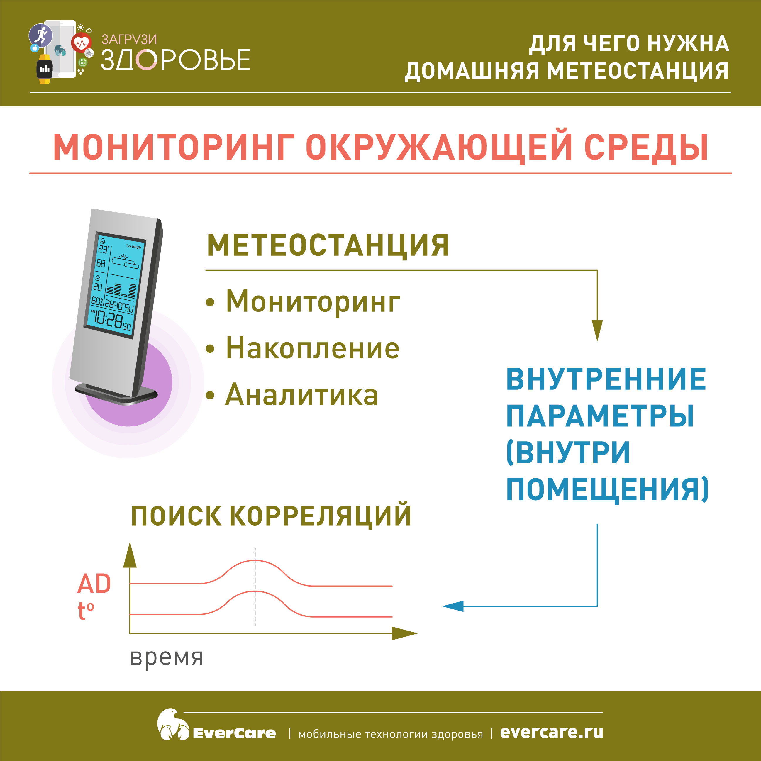 Рассмотрим, какие возможности есть у таких современных приборов, как домашняя метеостанция. Во-первых, это мониторинг, или постоянный съем информации в достаточном объеме и накопление данных как внутри прибора, так и передача через каналы связи в облачные источники хранения информации. Кроме того, это аналитика, т.к. вся ценность данных в их интерпретации. В связи с развитием такого понятия, как умный или здоровый дом, у нас появляются инструменты, с помощью которых мы можем построить некие развивающиеся во времени кривые, где можно отслеживать, допустим, показатель температуры или артериальное давление. В результате можно заметить некие корреляции. Так, если предположим наличие корреляции между повышением температуры и повышением артериального давления, то зная это, мы можем воздействовать на этот фактор, открыв форточку или включив кондиционер.