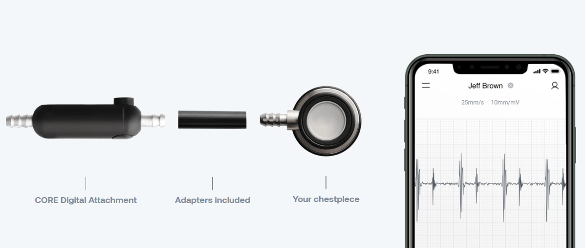 Одним из ярких примеров эволюции стетоскопа является Eko Core, который сегодня сертифицирован в Европе и США и в цифровом режиме способен усиливать звуки сердца в 40 раз, снижать белый шум и работать с семью уровнями усиления. Этот прибор даже позволяет пользователю точно его настраивать, учитывая на каком органе он фокусируются (сердце, легкие и т.д.) и положение пациента (сидя или стоя).