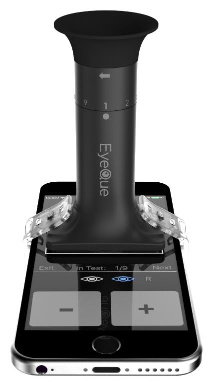 Компания EyeQue производит мобильные системы проверки зрения. Первая из них - Personal Vision Tracker - это автоматический оптический прибор, позволяющий обычному человеку (и тем более врачу) проверить зрение и даже заказывать очки на основании этих результатов.