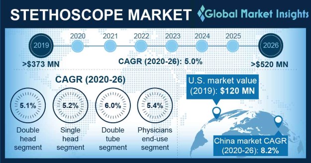 По данным Global Industry Analysts, мировой рынок cтетоскопов к 2026 году достигнет 514,7 млн долларов. В текущем году его объем оценивается на уровне 431,2 млн долларов. Сегмент ручных стетоскопов будет расти в среднем на 4,1% в год и достигнет 271,3 млн долларов к концу анализируемого периода. А вот темп развития сегмента электронных устройств составит 5,1% в год. Сегодня на их долю приходится 15% мирового рынка стетоскопов. Схожий прогноз делает и Global Market Insights (см. график).