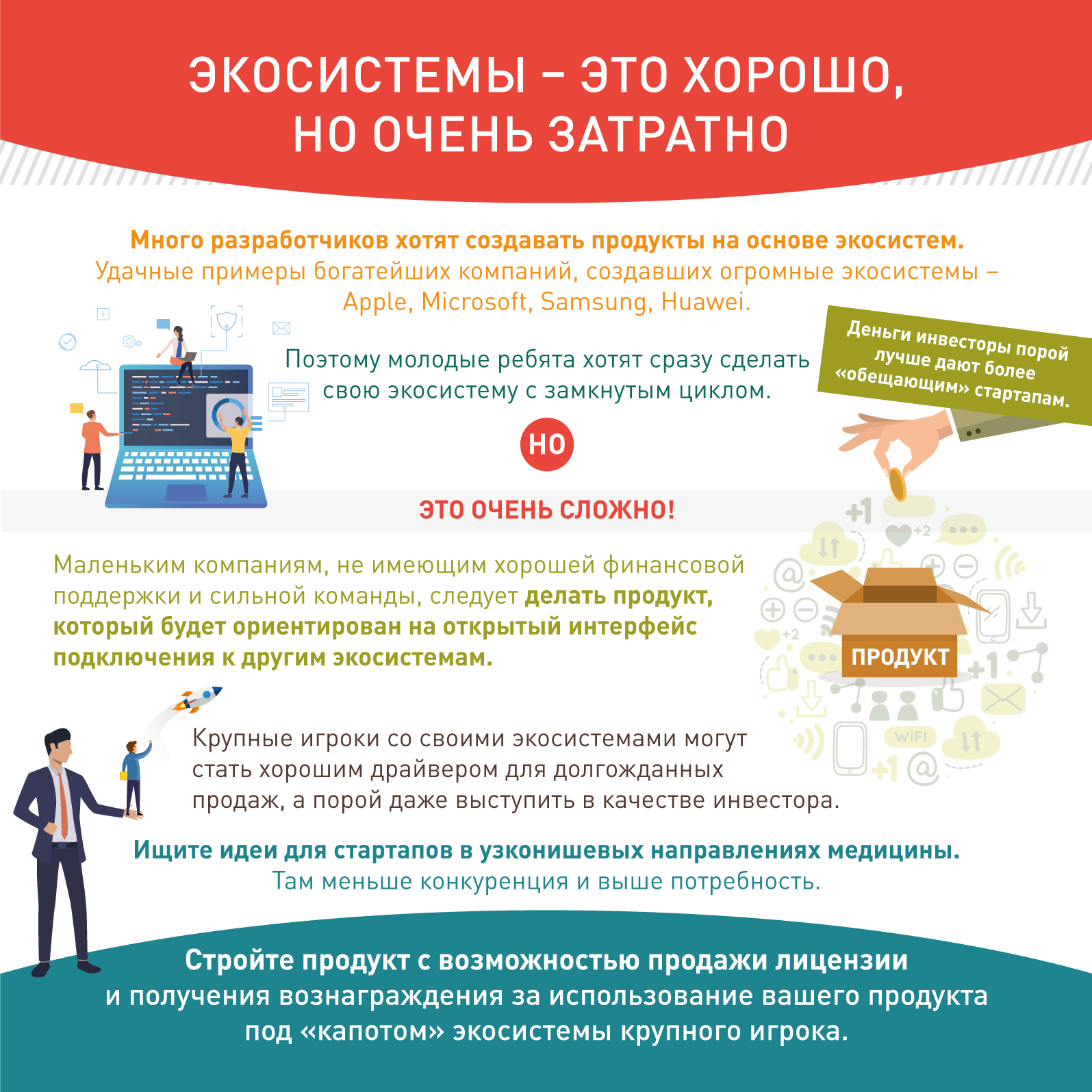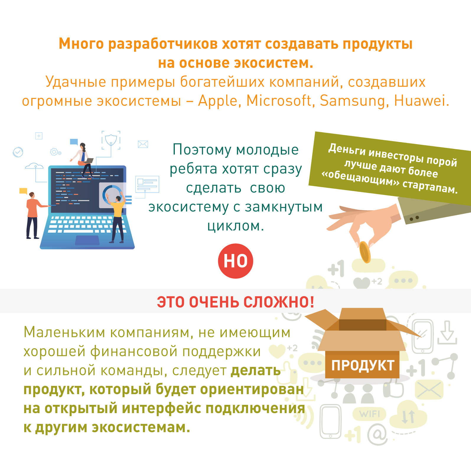 Много разработчиков хотят создавать продукты на основе экосистем. Понять их можно. С точки зрения самых удачных примеров бизнеса всегда на слуху компании, которым удалось создать огромные экосистемы – такие как Apple, Microsoft, Samsung, Huawei и другие из этого замечательного ряда богатейших компаний мира.