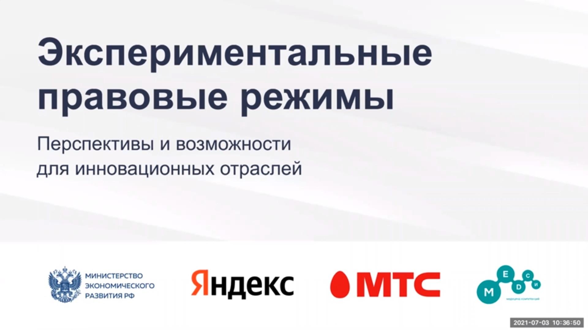 3 июля состоялась онлайн-конференция по вопросам экспериментальных правовых режимов в сфере цифровых инноваций при участии министра экономического развития - Максима Геннадьевича Решетникова и компаний МЕДСИ, Яндекс, МТС.