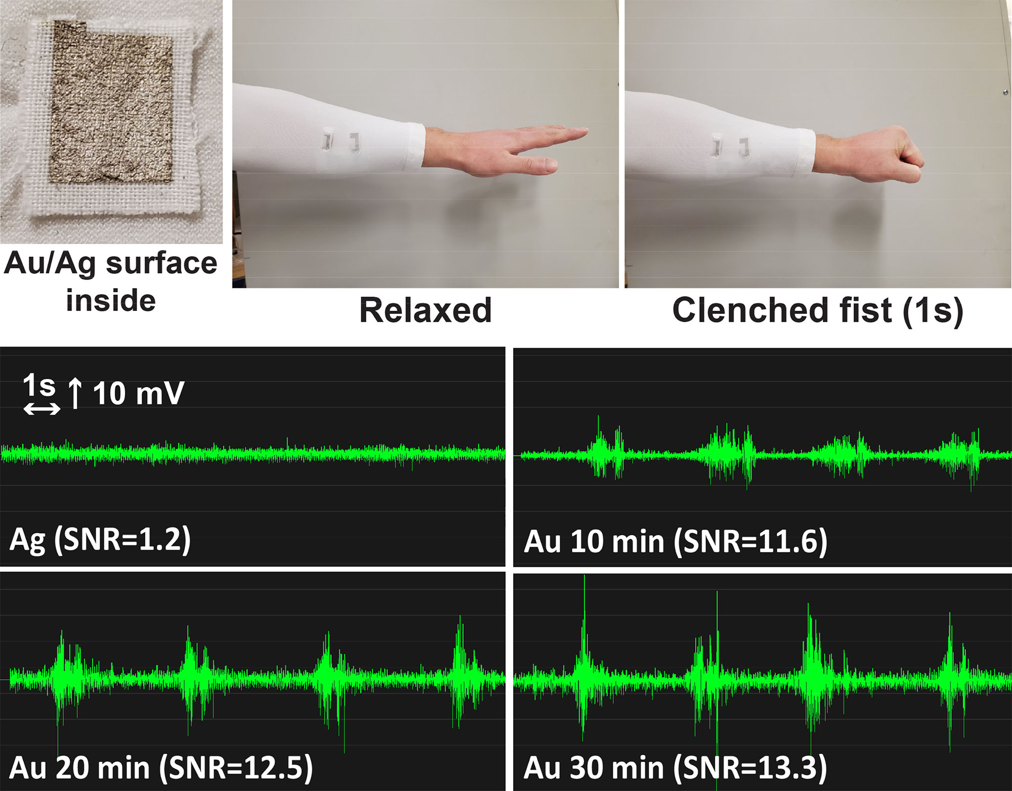 Ткань содержит сеть серебряных хлопьев и золотых наночастиц, которые обеспечивают проводимость и позволяют измерять электрические сигналы с высокой точностью с помощью портативного устройства для электромиографии (ЭМГ).