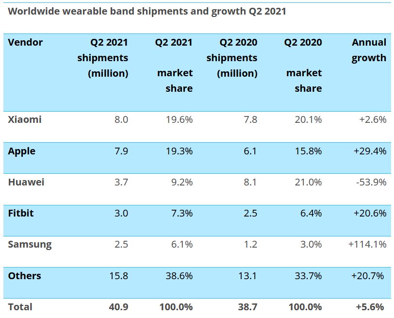 Во втором квартале 2021 года Xiaomi обогнала Apple и стала крупнейшим поставщиком таких устройств. Показателям Xiaomi способствовал запуск Mi Smart Band 6 несмотря на то, что Индия, один из "опорных пунктов" Xiaomi, не была включена в первоначальный список стран для глобального запуска браслета. Компания Huawei осталась на третьем месте, в основном полагаясь в своих продажах на Китай, чтобы удержаться на плаву. По словам аналитиков Canalys, быстрая переориентация Xiaomi на базовые часы также помогла компании увеличить поставки наручных часов на 1,3 млн единиц в этом квартале.