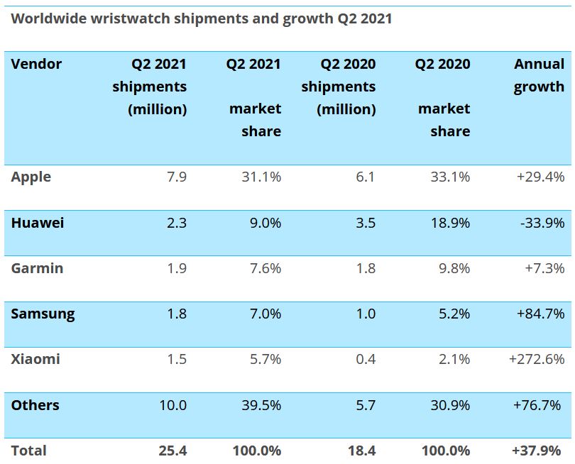 Apple продолжает лидировать на мировом рынке наручных часов, занимая значительную долю рынка - 31,1% во втором квартале 2021 года. Недавние изменения, произошедшие среди поставщиков, включают объединение Samsung с Google для разработки Wear OS 3, запуск Samsung серии Galaxy Watch 4 с новыми биосенсорами и 5-нм чипсетом, а также разработку собственных компонентов и решений для своих часов такими компаниями, как Oppo, Huami (Zepp) и другими, знаменует собой большой шаг вперед в развитии смарт-часов.