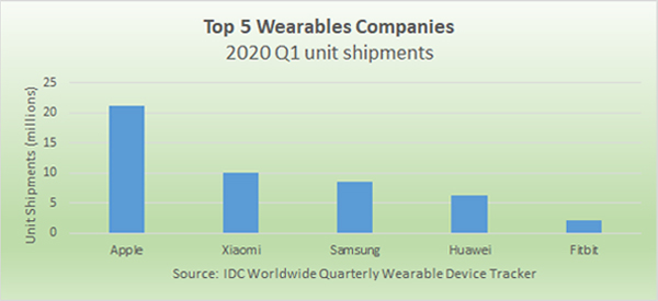 Крупнейшими производителями по объемам поставок в этом квартале были Apple (+59.9%, 21.2 миллиона устройств), Xiaomi (+56.4%, 10.1 миллиона устройств), Samsung (+71.7%, 8.6 миллионов устройств), Huawei (62.2%, 8.1 миллиона устройств) и Fitbit (-26.1%, 2.2 миллиона устройств). Цифры в скобках указывают на процентное изменение отгрузок из года в год и общее количество отгруженных единиц продуктов в 1 квартале текущего года.