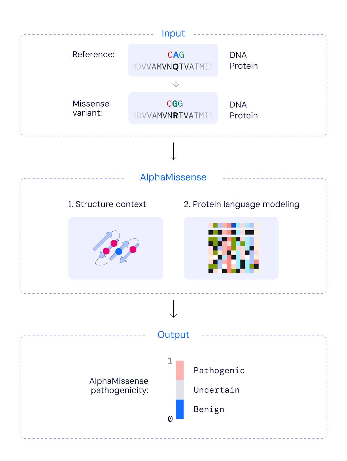 Новая модель, получившая название AlphaMissense, является адаптацией AlphaFold — разработки DeepMind, которая еще в 2020 г. позволила окончательно решить проблему сворачивания белков, долгие годы ставившую в тупик научное сообщество. Согласно новому исследованию, AlphaMissense "тонко настроена" на генетические различия человека и приматов и специально обучена выявлять генетические мутации (missense mutations)*, которые происходят в одной букве кода ДНК.