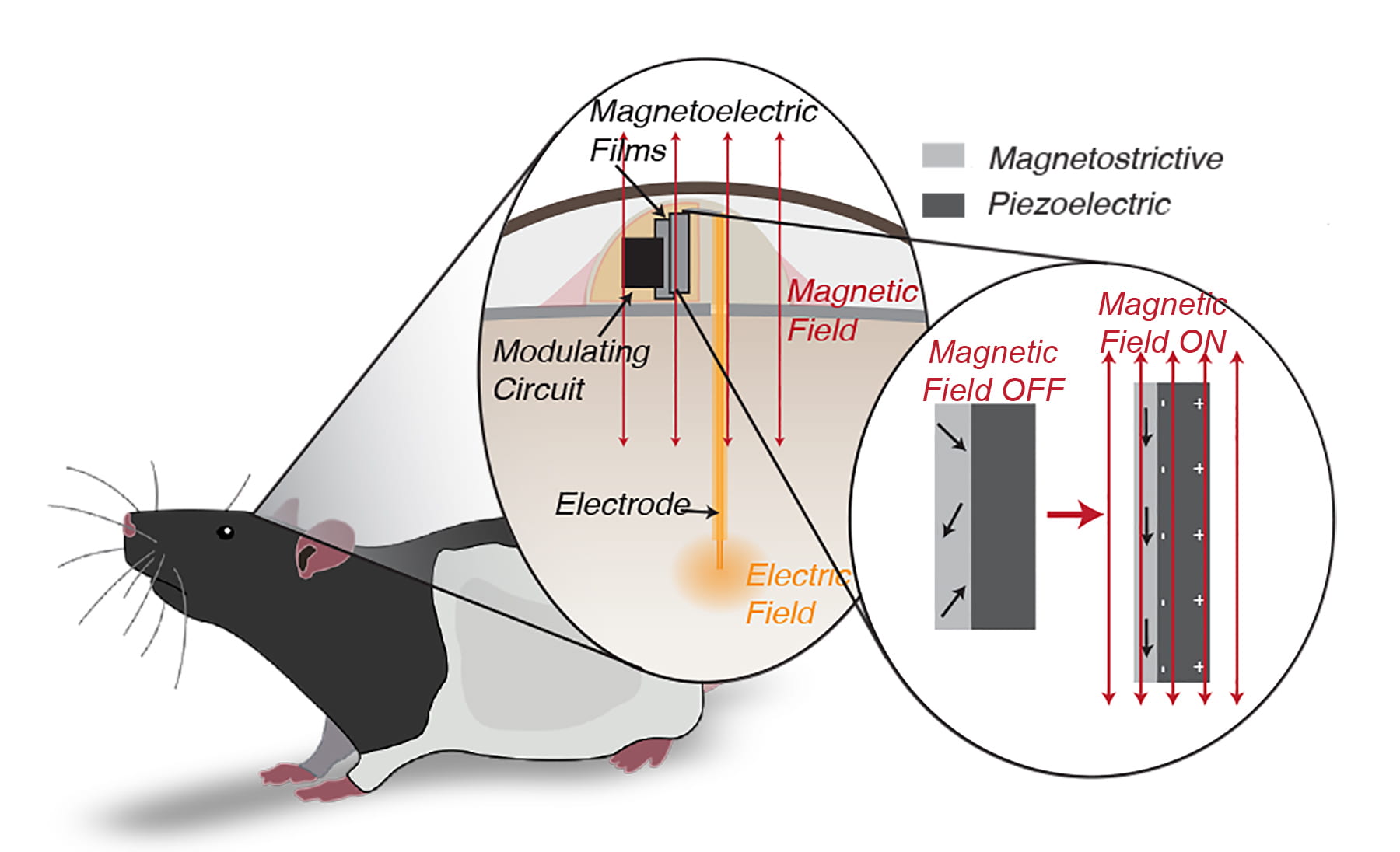 Крошечный новый имплантат, размером меньше рисового зерна, покрыт "магнитоэлектрическим" материалом, который производит электрическое напряжение в ответ на приложенное магнитное поле. Один слой материала вибрирует при наличии магнитного поля, а другой, пьезоэлектрический кристалл, стимулируется этой вибрацией для получения электрического напряжения. Частота колебаний слишком мала, чтобы влиять на соседние клетки.