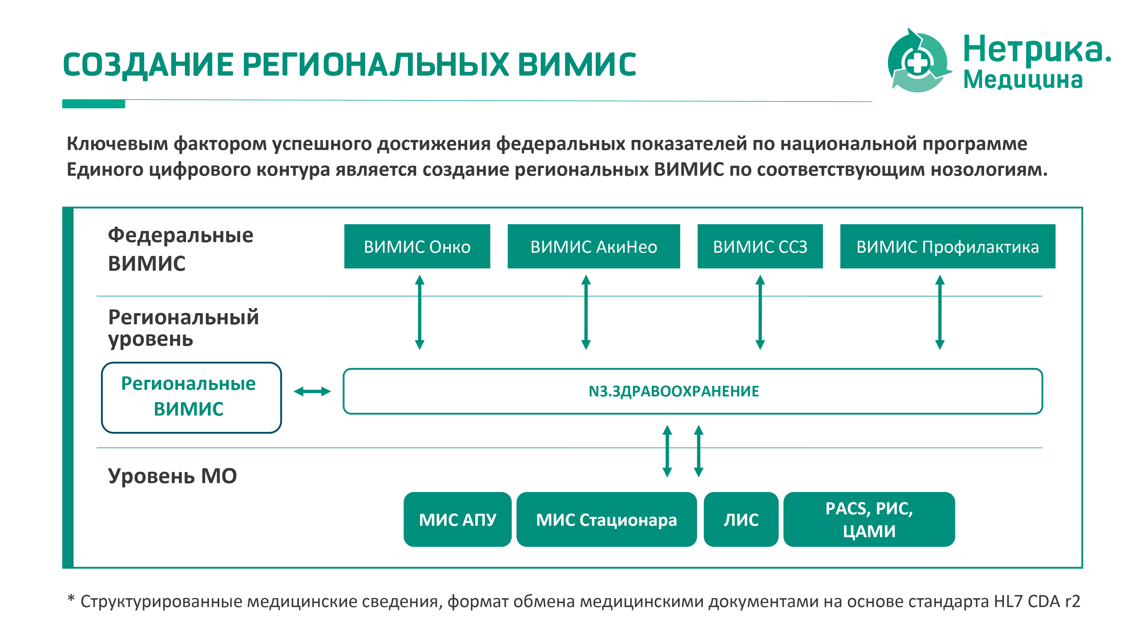 Одна из самых важных задач, которую региональным органам здравоохранения нужно решить в ближайшие год-два – разработка и внедрение в медицинских организациях региональных централизованных систем для взаимодействия с Вертикально-интегрированной медицинской информационной системой (ВИМИС) по отдельным профилям оказания медицинской помощи (нозологиям). Также требуется их качественная интеграция с ЕГИСЗ и региональными МИС.