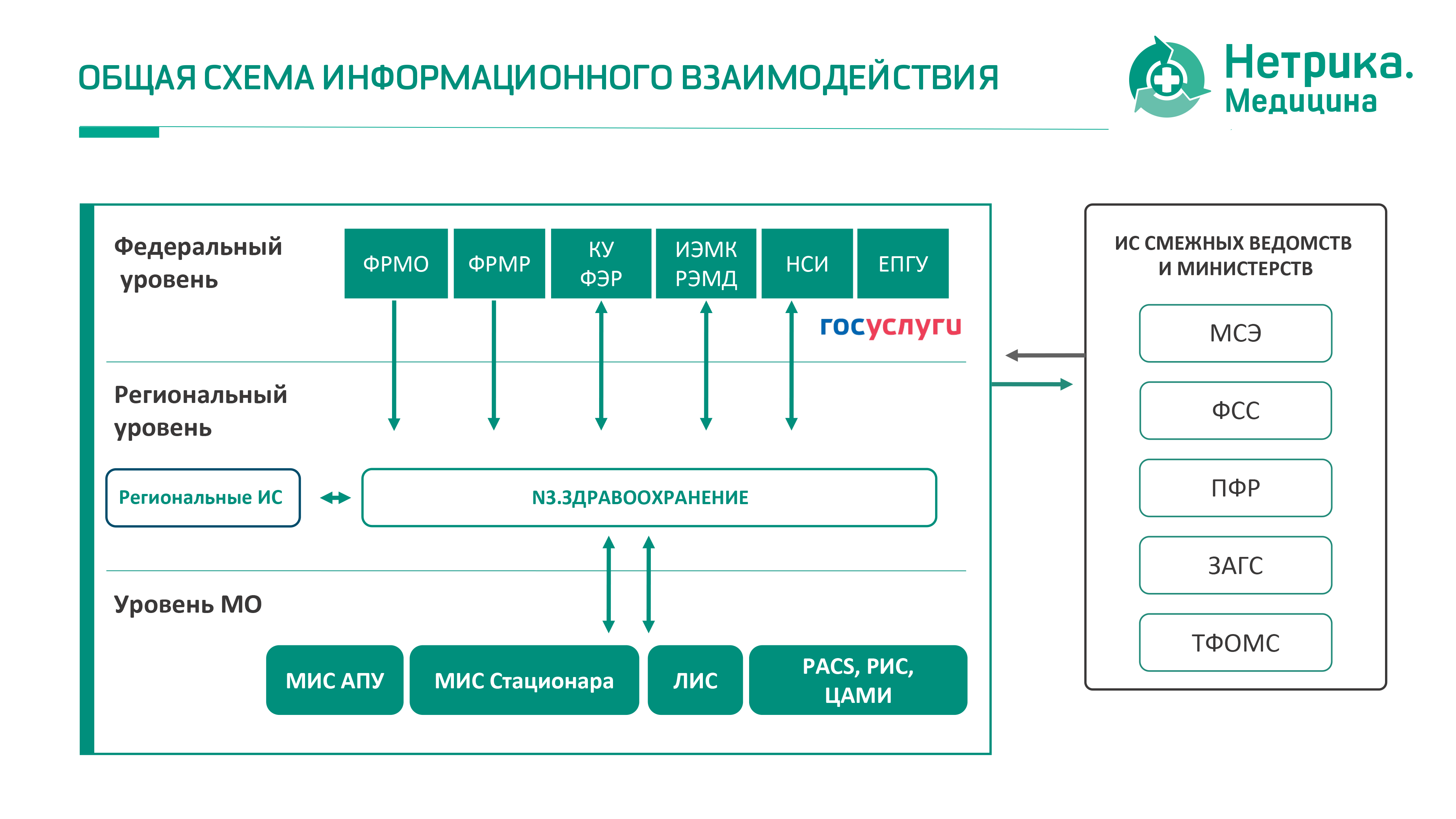 Компания «Нетрика Медицина» накопила большой опыт в области объединения информационных потоков между медицинскими организациями, а также обеспечения взаимодействия с региональными МИС и федеральными сервисами. Такое взаимодействие становится возможным благодаря интеграционной платформе, которая с помощью API позволяет различным медицинским системам, функционирующим на уровне регионов и отдельных клиник, общаться на одном языке и формировать унифицированные электронные медицинские документы. Результатом такой интеграции становится ситуация, при которой каждая поликлиника региона может получить полные сведения о наблюдаемом пациенте независимо от того, в каких медицинских учреждениях (в том числе коммерческих и ведомственных) он обследовался и лечился ранее.
