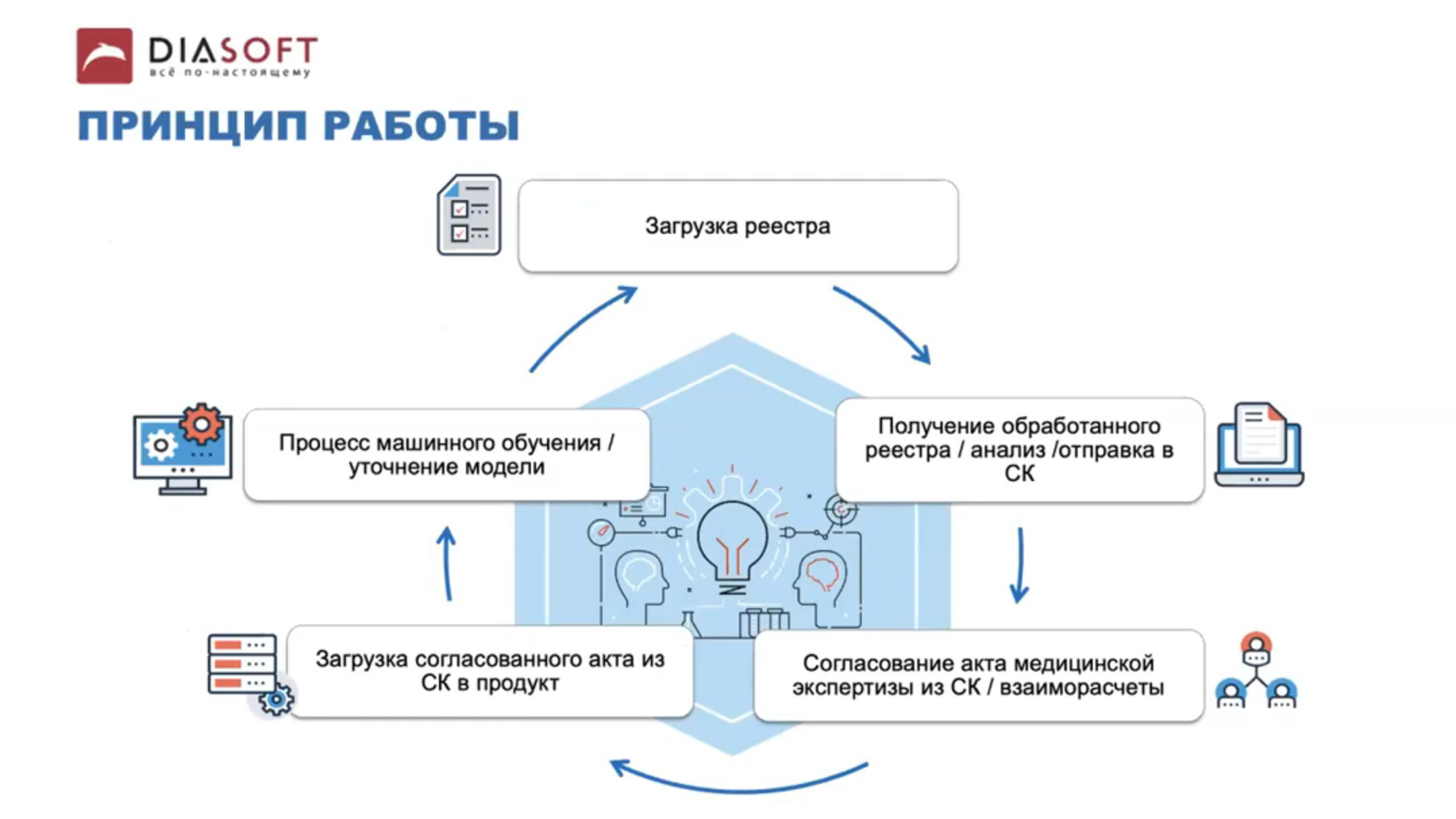 Взаимодействие ЛПУ и сервиса «Интеллектуальная медицинская экспертиза» происходит через личный кабинет на сайте. Страховой реестр загружается в виде файла Exсel. Сервис хранит информацию в деперсонализированном виде, поэтому клиенты могут не беспокоиться об утечке данных в сеть. Программа анализирует каждую строчку таблицы и прогнозирует риск отказа СК на возмещение стоимости услуги. После использования медицинской экспертизы и получения ответа от СК, результаты обратно загружаются в личный кабинет, и программа вновь обучается.