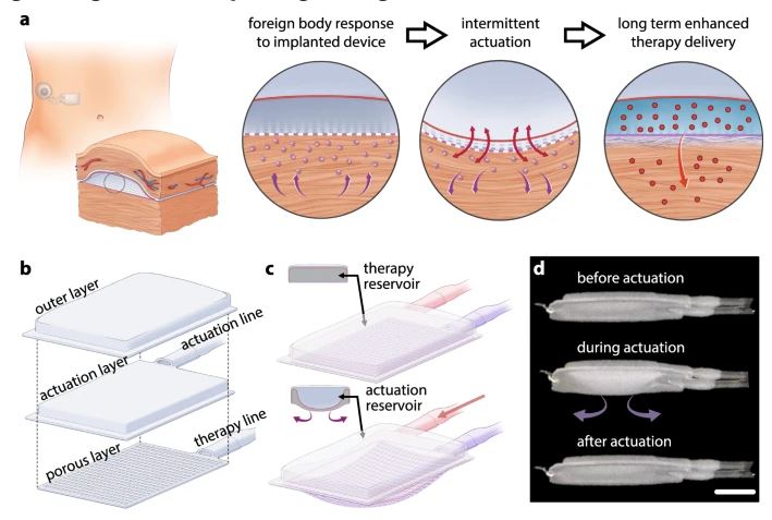 Исследовательская группа создала мягкий полиуретановый имплантат, содержащий две камеры: в одной находится резервуар, производящий инсулин, а в другую можно нагнетать давление, чтобы она выпячивалась по бокам. Подведенный под кожу, он подключается к внешнему контроллеру, который может заставить устройство надуваться и сдуваться раз в секунду в течение пяти минут дважды в день.