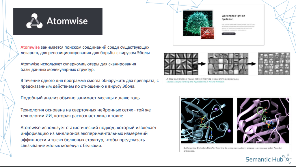 Анна: Среди IT компаний, занимающихся поиском молекул по их структуре — компания Atomwise. Дизайнеры лекарств успешно применили технологию сверточных нейронных сетей, которые обычно используются для технологии распознавания лиц в толпе. Компания адаптировала этот механизм и воспользовалась им для извлечения информации из миллионов экспериментальных измерений аффинности (силы взаимодействия молекул) из тысяч белковых структур, чтобы предсказать связывание малых молекул с белками, для поиска молекулы, которая могла бы быть активной по отношению к вирусу Эболы.