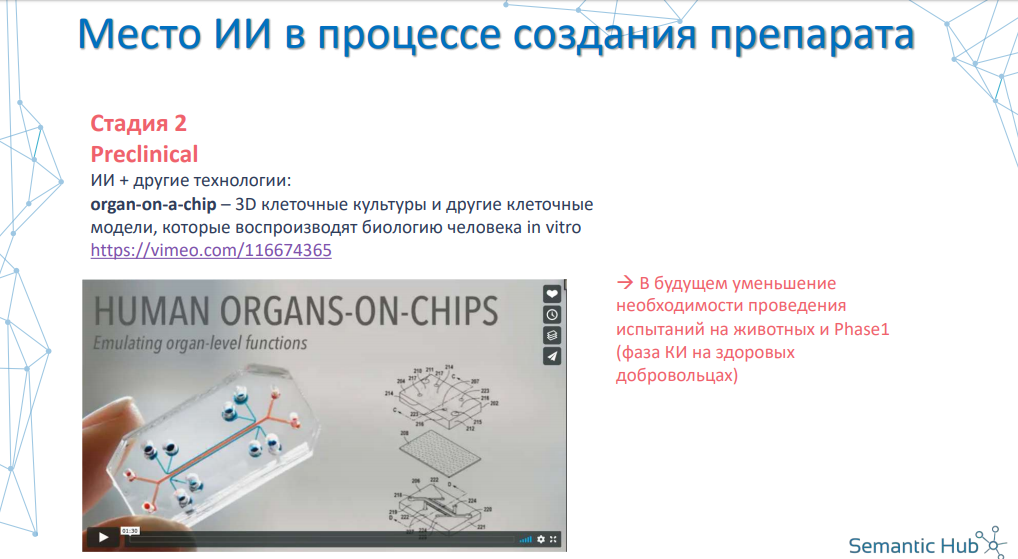 Была проанализирована довольно большая база молекул и найдена подходящая. Это — пример задействования уже существующих технологий для нужд фармкомпании Еще один интересный пример из области доклинических исследований, то есть исследований, проводящихся на клеточных или животных моделях — organ-on-a-chip — это 3D клеточные культуры, в которых можно воспроизвести биологию человека in vitro. На специальное трехмерное микрофлюидное устройство, искусственную мембрану, высаживают клетки лёгких с одной стороны и эндотелиальные клетки с другой, создают давление, кровоток и инфицируют бактериями для моделирования воспалительных процессов, происходящих in vivo в тканях легких.