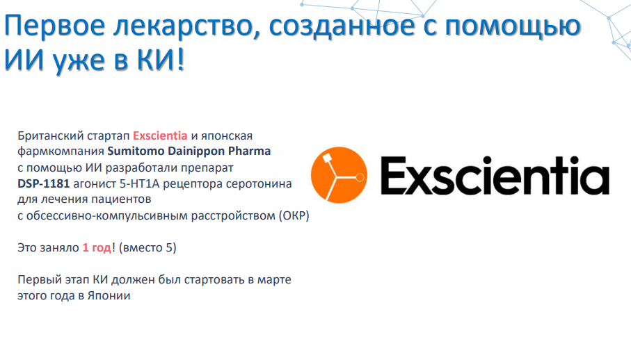 Третий пример — компания Exscientia, которая разработала первое лекарство, вышедшее на стадию клинических испытаний. Совместно с японской фармацевтической компанией с помощью искусственного интеллекта они разработали препарат DSP-1181, являющийся агонистом 5-HT1A рецептора серотонина. Препарат предназначен для лечения пациентов с обсессивно-компульсивным расстройством (ОКР). Вся разработка заняла один год вместо положенных 5-6 лет, которые обычно уходят у исследователей на этап Drug discovery. В марте этого года должна была стартовать первая фаза клинических испытаний в Японии, но из-за разразившейся пандемии Covid-19 пока нет информации о том, все ли идет по плану.