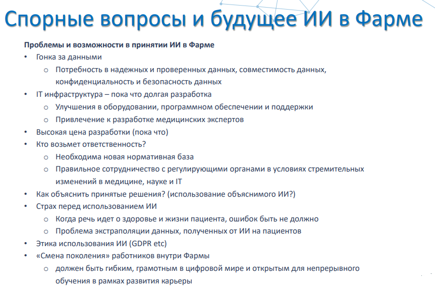 Если разработчики ИИ собираются работать с фармкомпанией, то им нужно будет обязательно сотрудничать с медицинскими R&D департаментом. Или потребуется включить в штат собственных медиков, которые будут помогать в разработке. Пока все вышеперечисленное обходится достаточно дорого.
