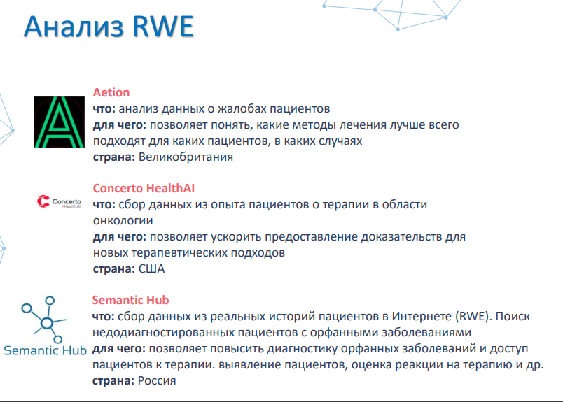 Анна: Системами получения доказательств в условиях рутинной клинической практики в Российской Федерации занимается компания Semantic Hub. Мы анализируем данные, полученные реальных историй пациентов в Интернете (RWE), занимаемся поиском недодиагностированных пациентов с орфанными заболеваниями. Наш подход позволяет улучшить диагностику орфанных заболеваний и доступ пациентов к терапии. Обеспечивает решение следующих задач: выявление пациентов, оценка реакции на терапию, углубленное понимание пути пациента на этапе прелонча (до выхода препарата на рынок), анализ value proposition препарата для задач Market Access и другие.