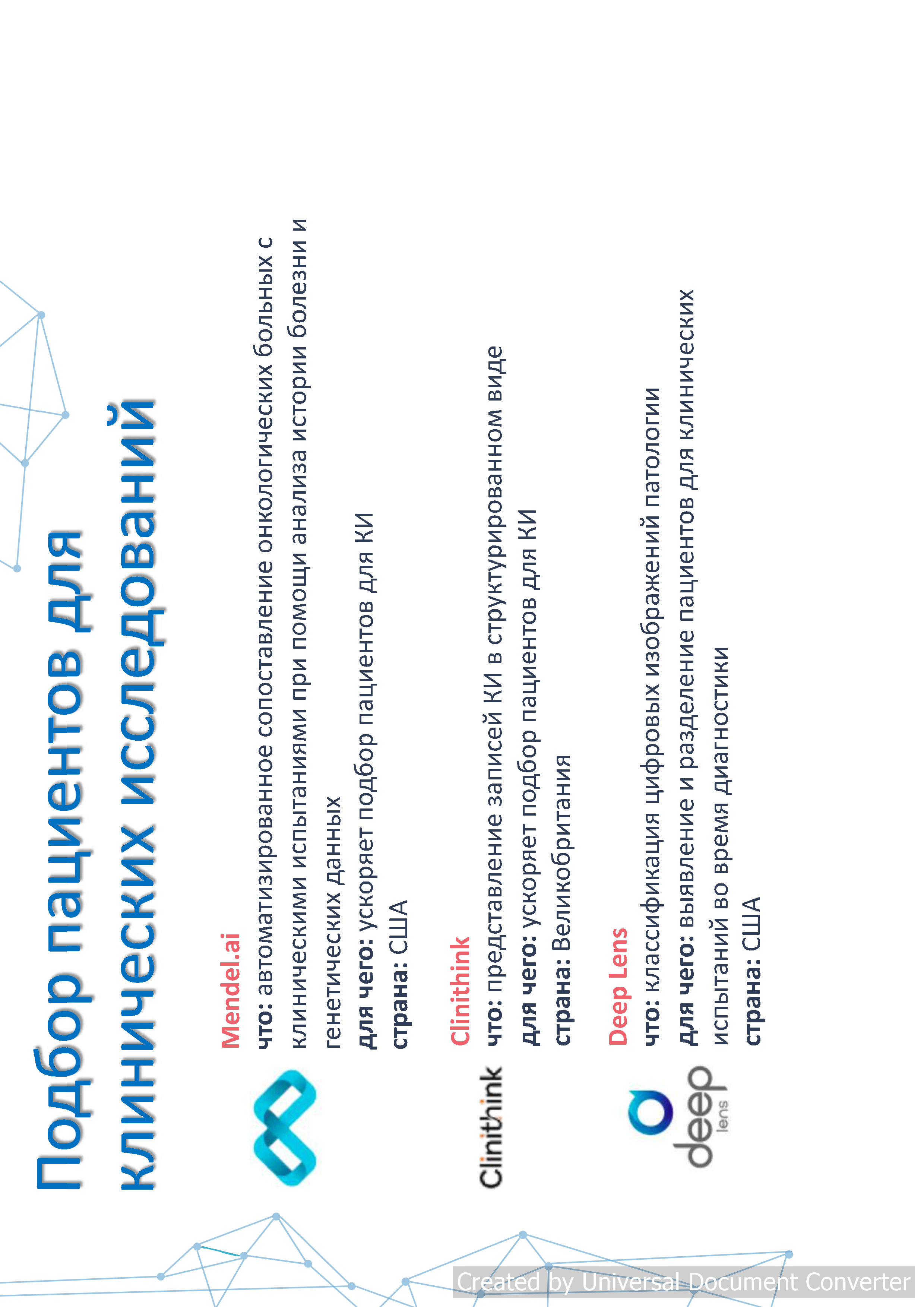 Анна: Одни компании занимаются автоматизацией анализа гистопатологии, другие — специализируются на подборе пациентов для клинических исследований, оптимизации клинических исследований.