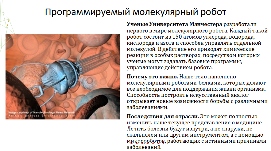Первые молекулярные роботы начали проходить испытания. Они могут управляясь химическими реакциями, могут совершать те или иные манипуляции получая информацию на молекулярном уровне. Эту новую технологию можно сравнить по своим перспективам, наверное, с генным редактированием.