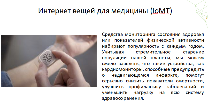 — Интернет вещей тоже стоит рядом с робототехникой. Всё больше используются компактные кардиомониторы, которые могут измерять различные параметры здоровья. Кардиологические заболевания занимают первое место по смертности. Когда робот передает данные о работе сердца, специальный софт их анализирует и может заранее предсказать грозные признаки начала заболевания возможного кризиса, и таким образом спасти жизни. Очень важная, и в то же время простая в использовании технология.