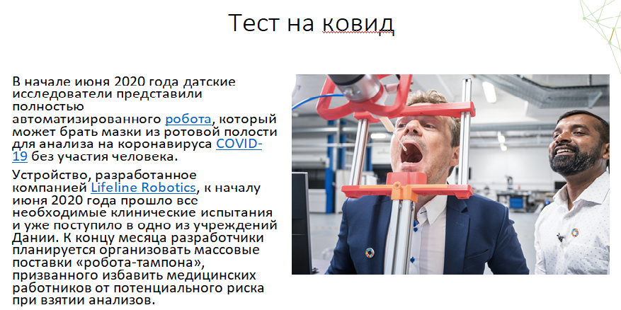 Раздел медицинских роботов, без всяких сомнений, будет расти сейчас еще больше в связи с пандемией.
