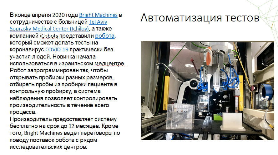 В Израиле тоже запущен такой робот, который проводит всю процедуру тестирования от начала до конца без участия людей: открывает и закрывает пробирочки, наблюдает за процессом с очень высокой производительностью и с очень большой скоростью.