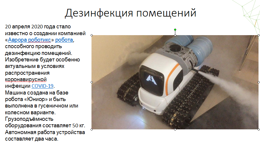 Одна из российских компаний «Avrora Robotics» делает разного размера автономно управляемые машины. На базе одной из своих мобильных платформ она сделала распылитель с бочками на 50 килограмм. С их помощью можно продезинфицировать помещения и улицы.