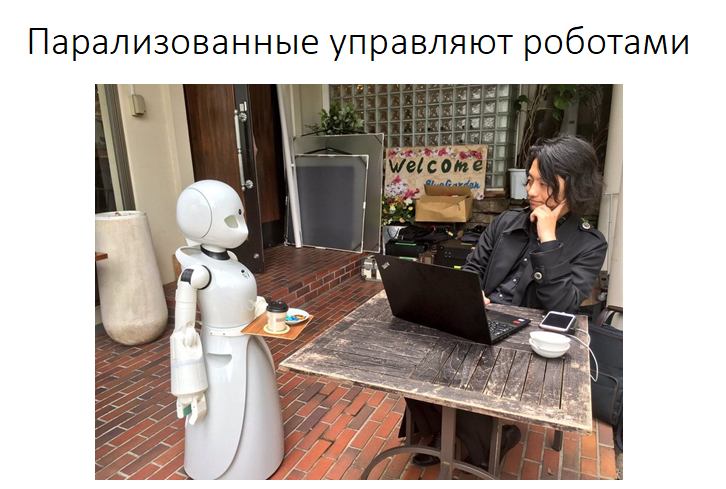 — В Японии есть кафе в Токио, где обслуживают роботы. Они управляются парализованными людьми, которые лежат в своих кроватях и могут шевелить только глазами или одним пальцем. Их примерно 15 человек и за каждым закреплен такой робот-аватар, через камеру в его лбу они наблюдают и видят все. Они управляют его движением, могут разговаривать с посетителями кафе. Этот кейс показывает возможность социальной реабилитации людей, когда они могут жить, приносить пользу и даже зарабатывать деньги.