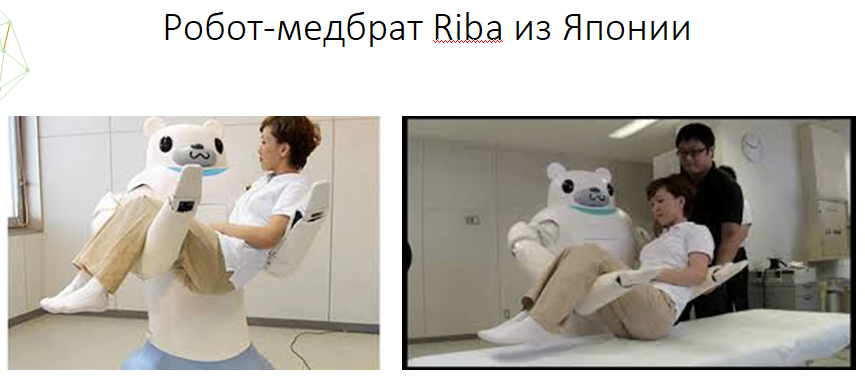 Японцы сконцентрировались на разработке роботов в помощь пожилым. Робот-медвежонок может человека поднять из коляски, перенести, отвезти куда-то, уложить на кровать, отнести в туалет. Он может разговаривать, напоминать о приеме лекарств.