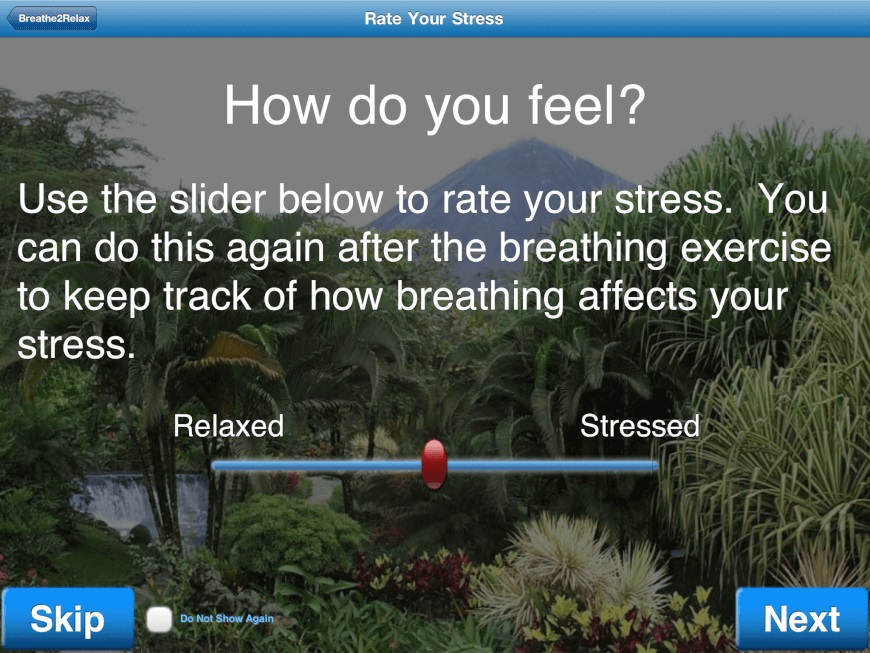 Многие специалисты в области психического здоровья считают диафрагматическое дыхание или глубокое дыхание животом одним из самых полезных средств для снятия стресса. Приложение Breath2Relax помогает пользователям освоить этот навык управления стрессом, чтобы снизить реакцию организма проблемы, и помогает стабилизировать настроение, контролировать гнев и управлять тревожностью.