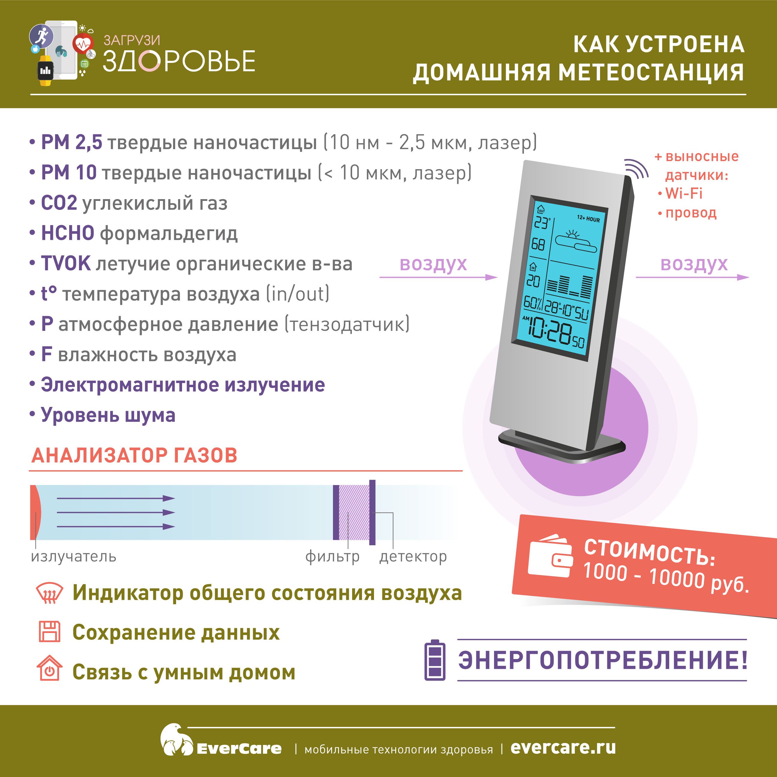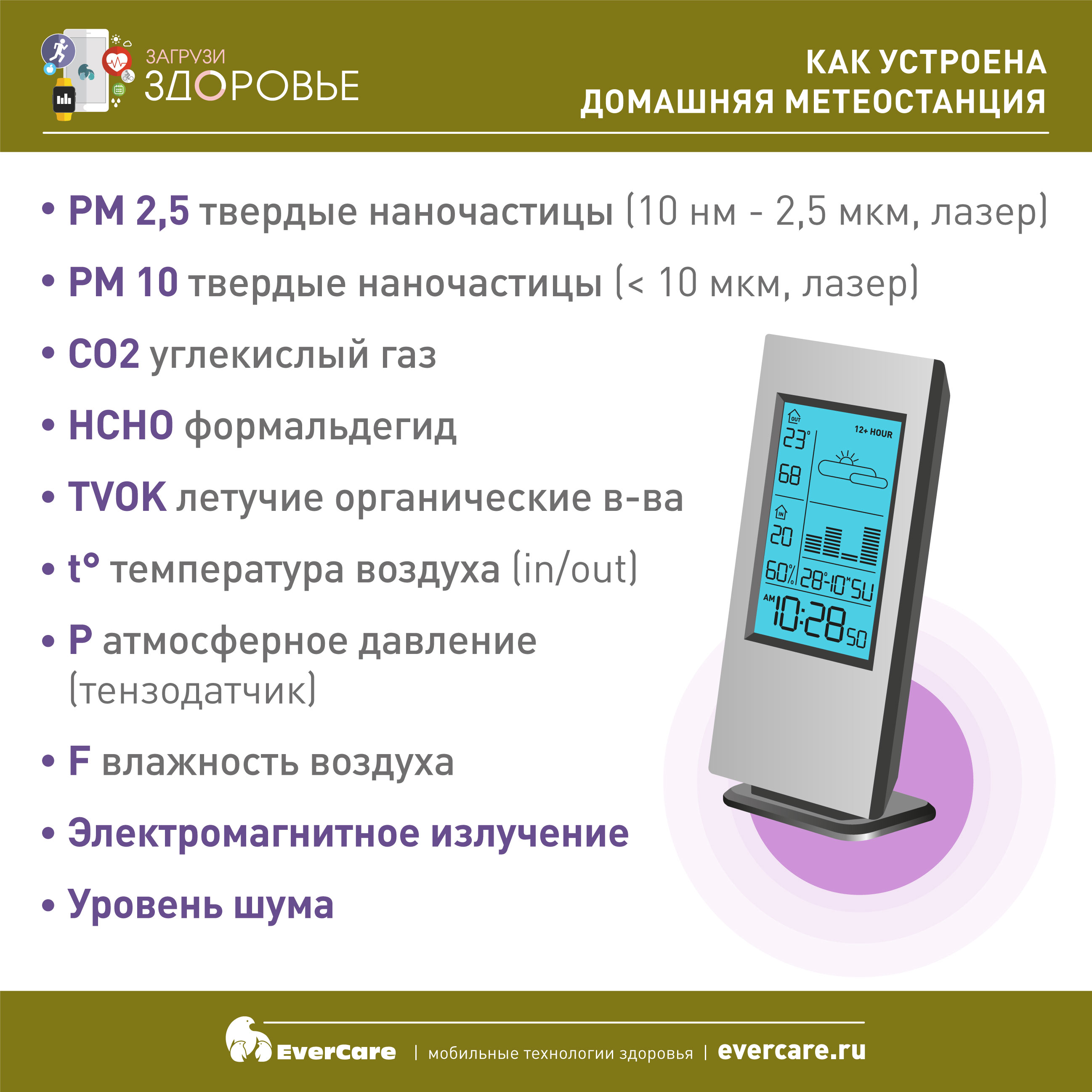 В продолжение разговора об устройствах для мониторинга здоровья поговорим о домашней метеостанции: что это такое и как устроена. Это прибор, который мониторирует окружающую обстановку – воздух, качество воздуха, температуру, давление. Все рассматриваемые параметры крайне важны для нашего здоровья.