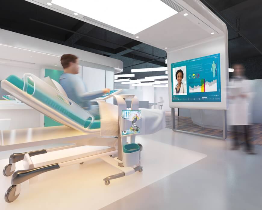 Например, в рамках проекта "Комната пациента 2020" некоммерческая проектная организация NXT Health спроектировала будущее больничных палат. Это проект, разработанный дизайнерами совместно с медицинскими работниками с целью "улучшения опыта пациентов и оптимизации работы медперсонала". Он отличается обтекаемым дизайном, ориентированным на пациента, развертываемой прикроватной рабочей зоной со встроенными технологиями, а также различными элементами безопасности. К сожалению, проект еще нигде не был реализован, что доказывает, что даже лучшие идеи могут застрять на стадии реализации.