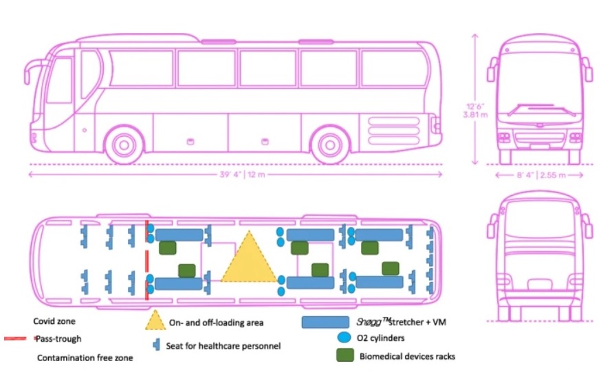 Для достижения этой цели была предложена концепция коллективной скорой помощи (CCCA) в виде междугородного автобуса, перепроектированного и оборудованного для размещения до шести пациентов, нуждающихся в интенсивной терапии, и позволяющего использовать методы Advanced Life Support в пути.