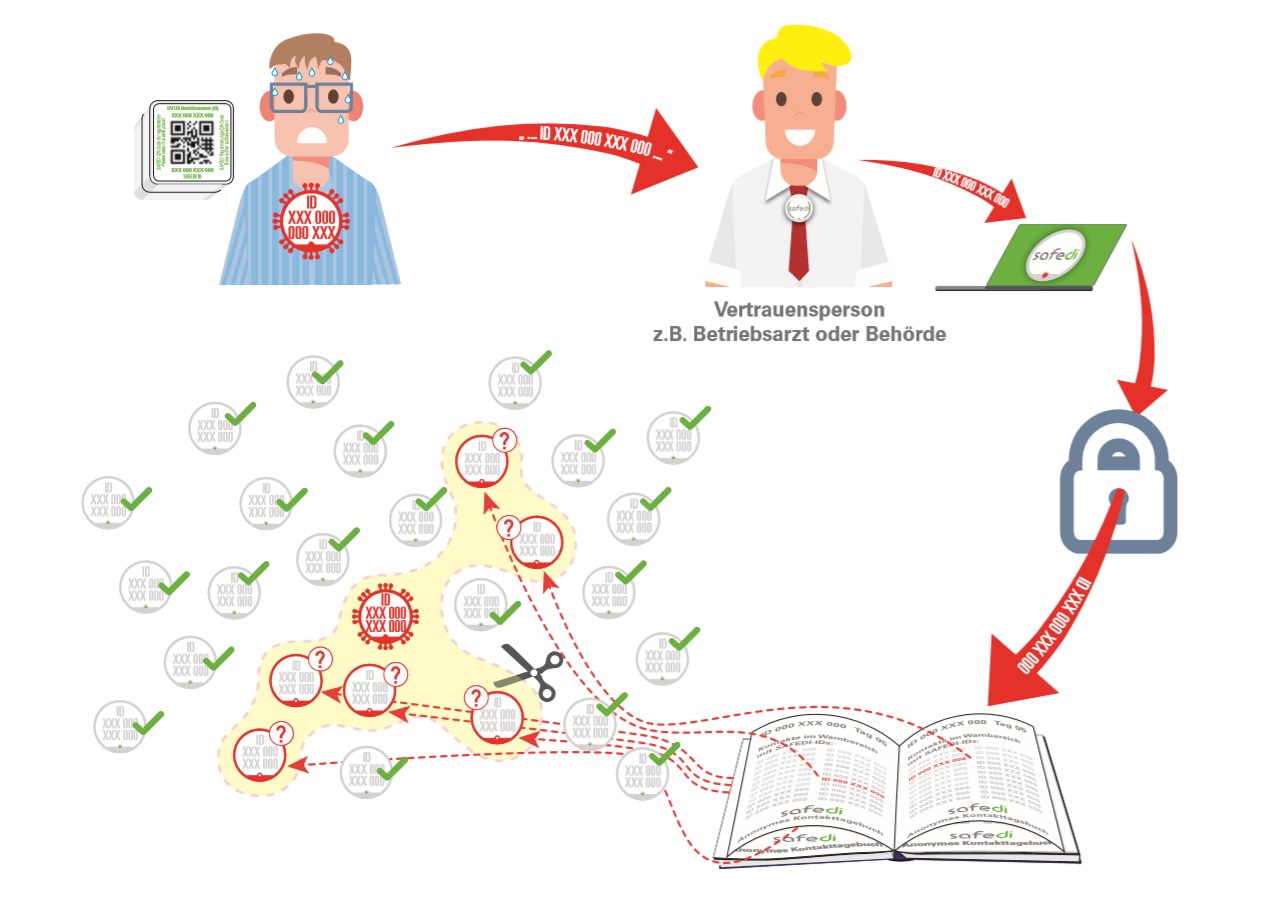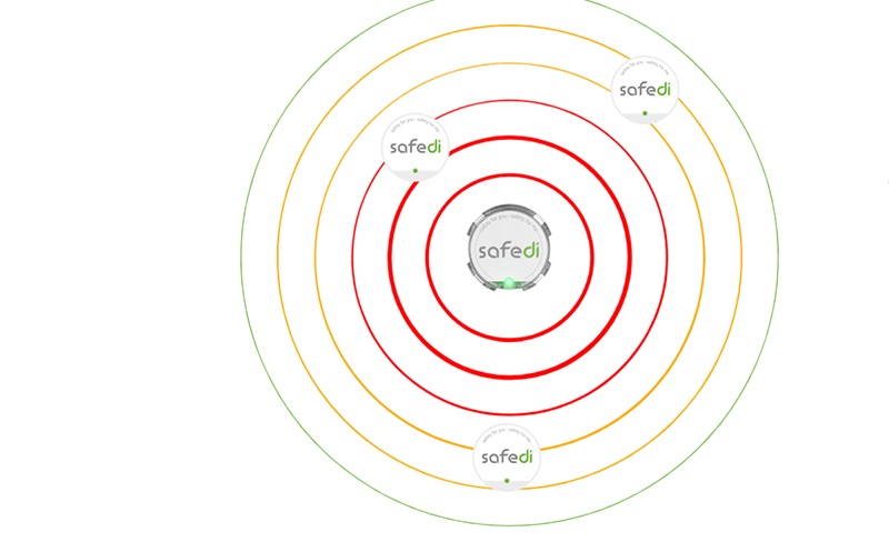 Устройство представляет собой клипсу весом 15 граммов и размером с большую монету, и может быть прикреплена к одежде или носиться на цепочке. Дальность его действия составляет примерно восемь метров. Как только люди приближаются друг к другу, устройство SAFEDI включает оптическую сигнализацию в качестве предварительного предупреждения. Если два человека приблизятся друг к другу на расстояние меньше пороговой величины, раздастся одновременно оптический и акустический сигналы. Все пользователи могут зарегистрировать свои устройства в режиме онлайн, после чего они будут фиксироваться в анонимном журнале тесных контактов. Журнал регистрирует, какие идентификационные номера приблизились друг к другу на небезопасное расстояние. Как только инфекция обнаружена у кого-нибудь из сотрудников, устройства людей, находившихся в тесном контакте с зараженными людьми, уведомляются об этом посредством push-сообщения, которое содержит рекомендации по необходимым действиям.